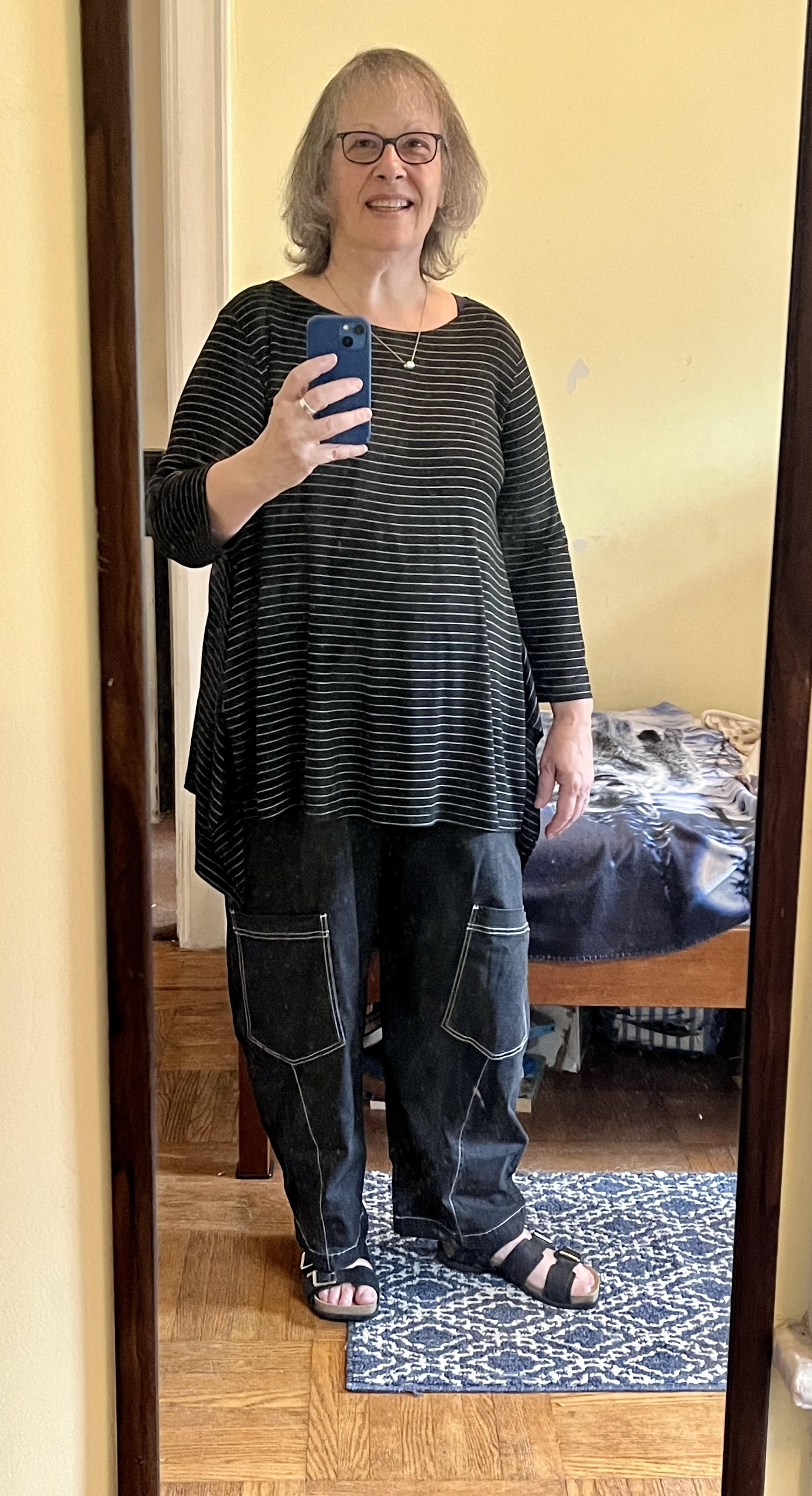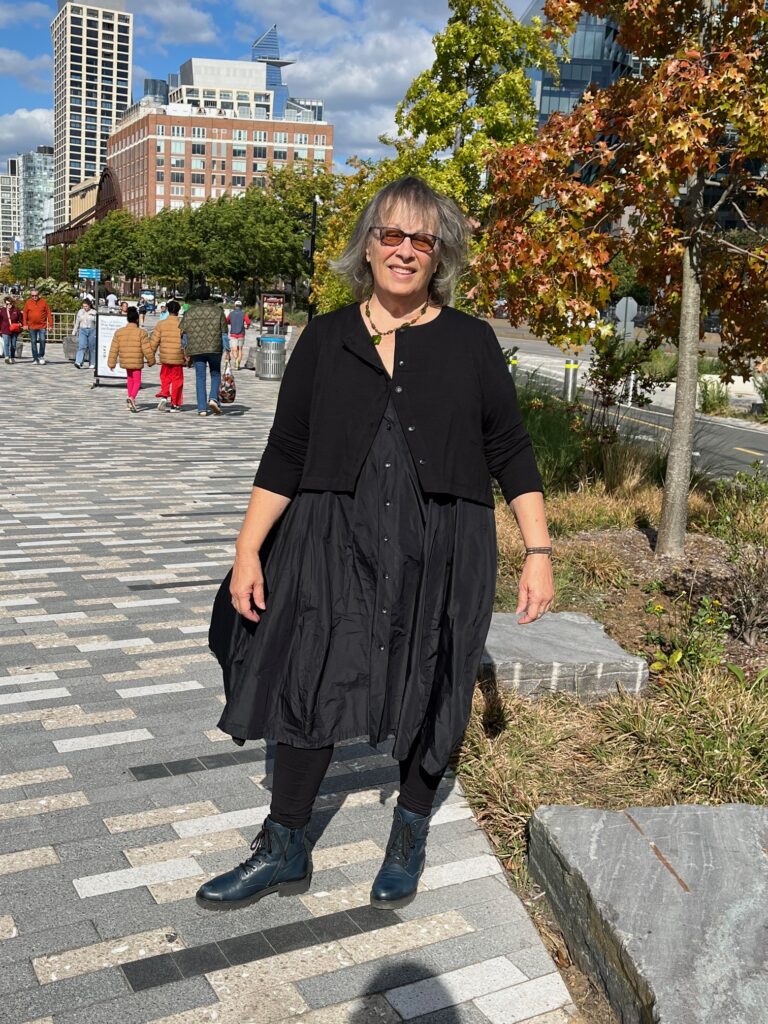 Yael was kind enough to let me come to the showroom to try on a few pieces I was interested in. Sometimes, what you think you want and what works are different things. And then I saw this dress hanging by itself on a rack – I swear it whispered for me to come over. The moment I tried it on, I lit up. A kind of goth/babydoll with stomper boots look and I felt like I was alive (but faithful to myself) as I turned 67 last fall! I love clothing – but have enjoyed not being a slave to it as I get older. I’m choosing what makes me happy. Somehow, this dress found my essence. Youthful in spirit, mischievous but feet firmly on the ground – even if the calendar says something else.