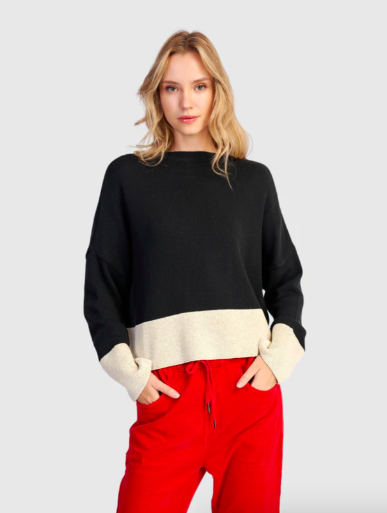 Two favorites are our Fatima Draped Top in Mix (also in Black) and Vista Block Sweater in Cream (also in Red and in Mix).