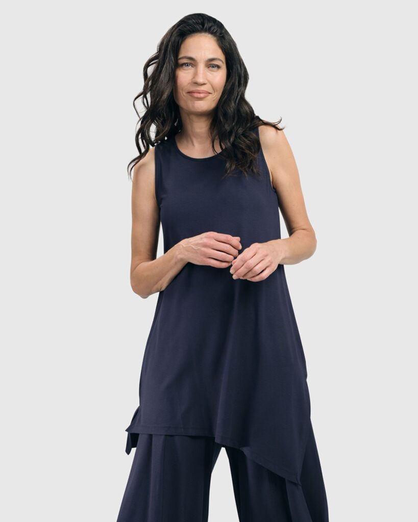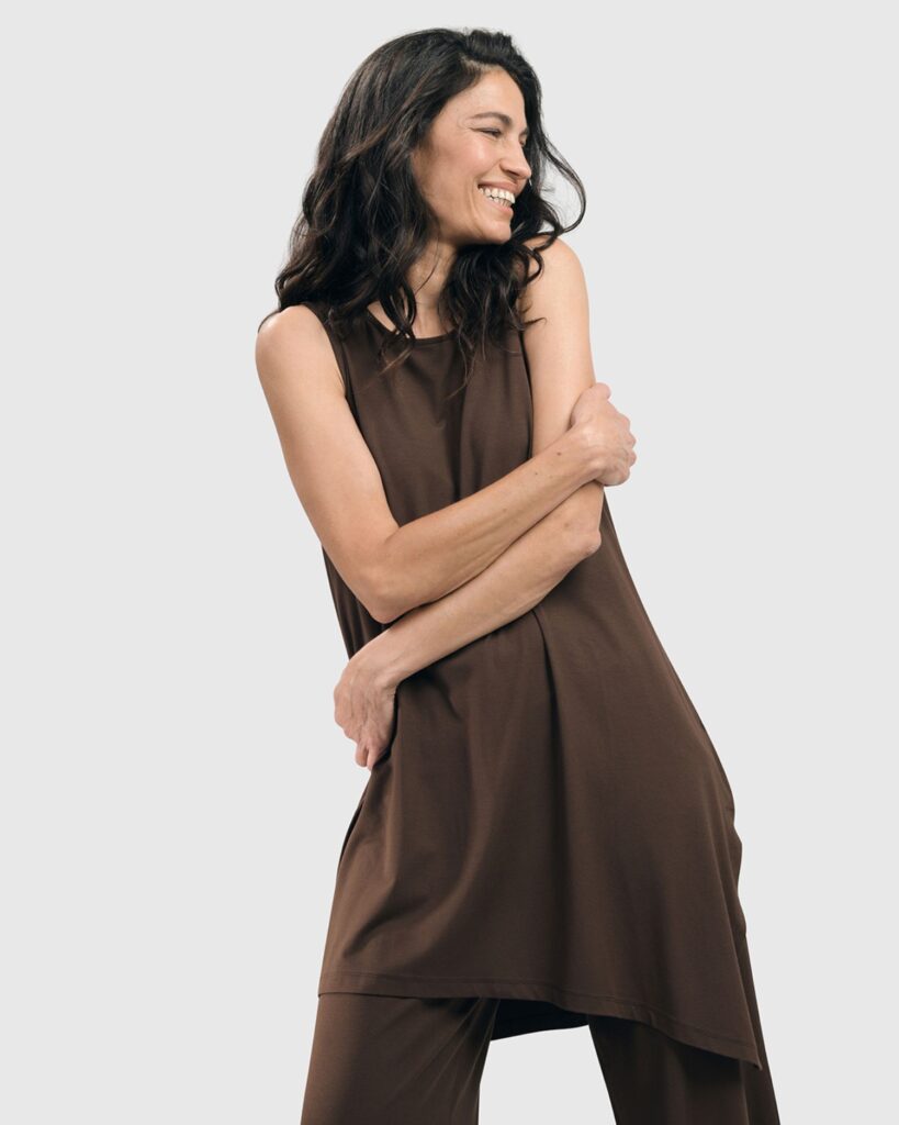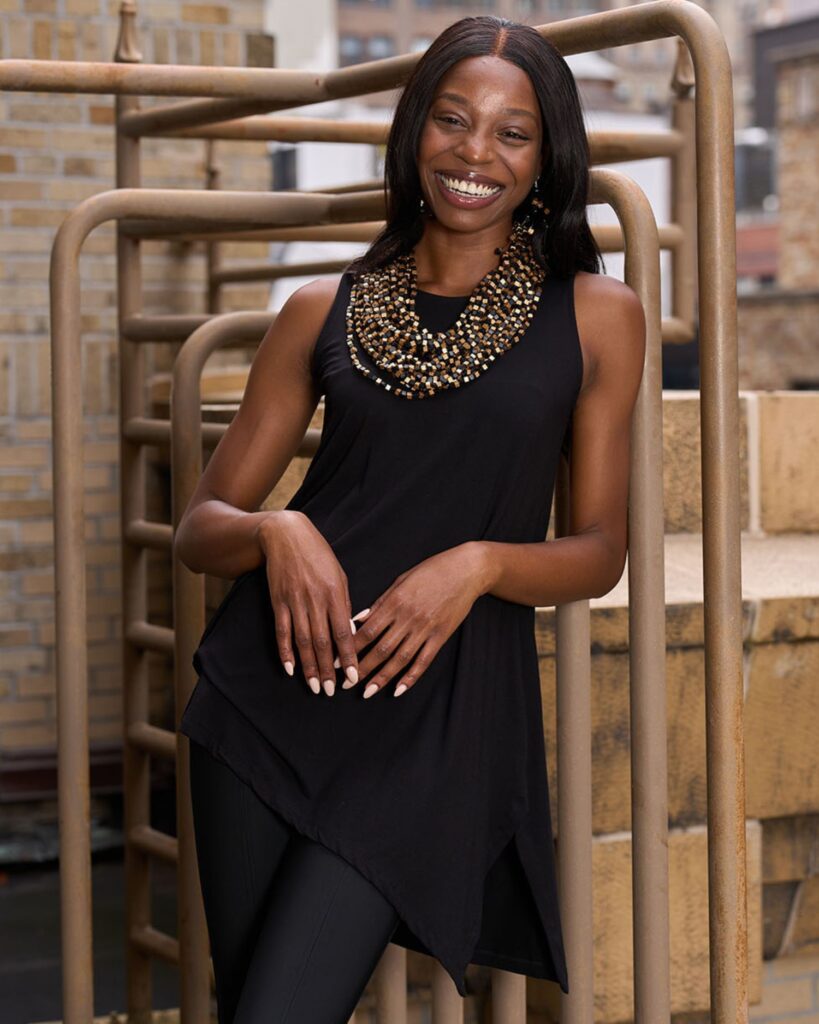 Kayeli is also donning our ESSENTIAL SLEEVELESS TUNIC TOP in Black. Dressed up, down and everywhere in-between, it’s a piece you may be tempted to collect, as it comes in 4 additional colors—Navy, Plum & Coffee, shown here on Liraz and Meyrav—as well as a gorgeous GREEN. This sleek and delicious jersey knit is the reliable go-to top you’ll grab over and over again,as it goes with everything in your closet and layers like a pro. The effortless pullover is cut for beautiful shape and drape with an asymmetrical hem for gorgeous proportions.