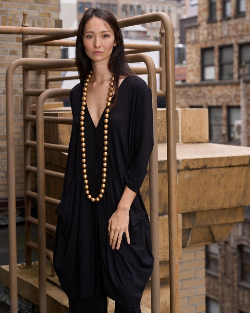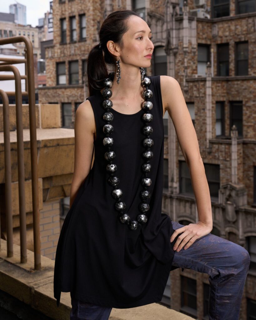 Jianhui’s wildly creative designs start with recycled plastic water bottles and reclaimed wood—and are transformed into unique statement pieces that are joy-producing. You’ll feel as great as you look wearing them because each necklace is infused with love—love of fashion, love for the environment, and a commitment to making bold statements that elevate everything you love to wear—the faves in your closet as well as our ELEVATED ESSENTIALS, shown here.