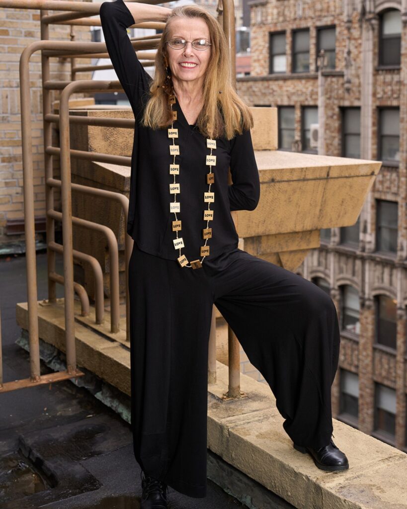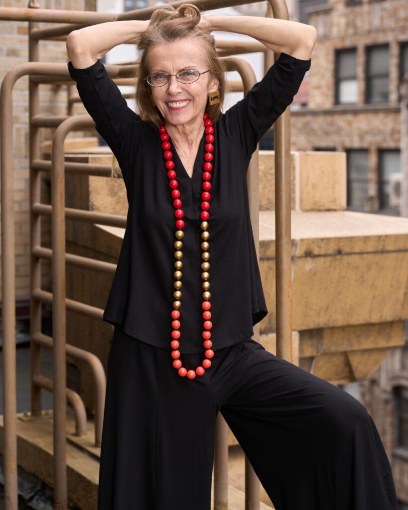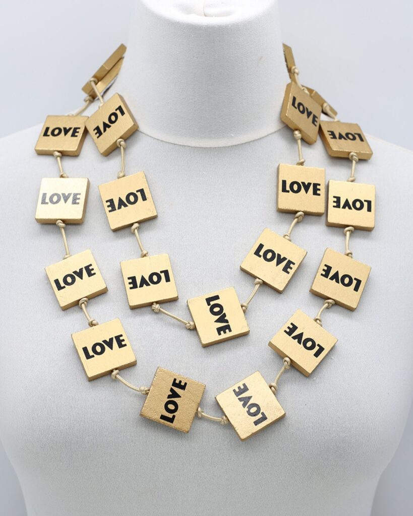 Carol is wearing Jianhui’s LOVE SQUARES NECKLACE, which shines with gold-painted recycled wood on dyed-to-match leatherette. Each square is stamped with love letters to express an open heart. She finished her effortless look with our ESSENTIAL V-NECK TOP & PUNTO PANTS—the virtual Alembika Essentials “starter kit” that equips your closet with two foundational pieces you’ll wear every which way, season to season, year after year (really). The V-neck Top and Punto Pants are the first Essential designs that started an evolution—true best sellers that we cannot say enough about! Now we are proud to offer 50+ Essentials pieces in a slew of amiable colors.