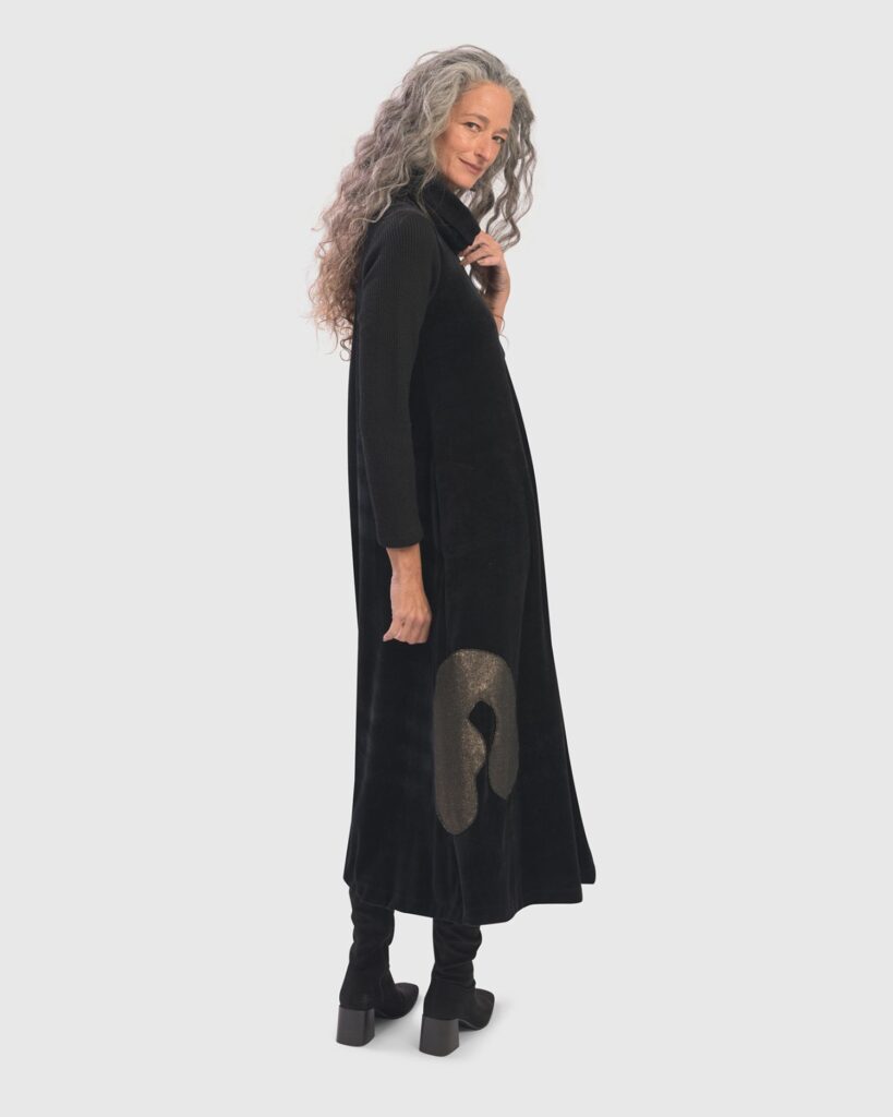 Some fabrics are inherently special and velvet is one of them… It’s plush, luxurious and has a subtle sheen—and ours is knit with stretch that gives it incredible drape and flow. Our sumptuous stand-out in a fluid maxi length with elegantly draped cowlneck flaunts a shimmery goldtone abstract “a” for Alembika, appliquéd on the side. It’s so easy to wear in a pullover style and features rib-knit sweater sleeves for textural interest. The silhouette is gently fitted through the bust, then flared to perfection from the waist to the ankle-skimming hemline. It’s a knockout!