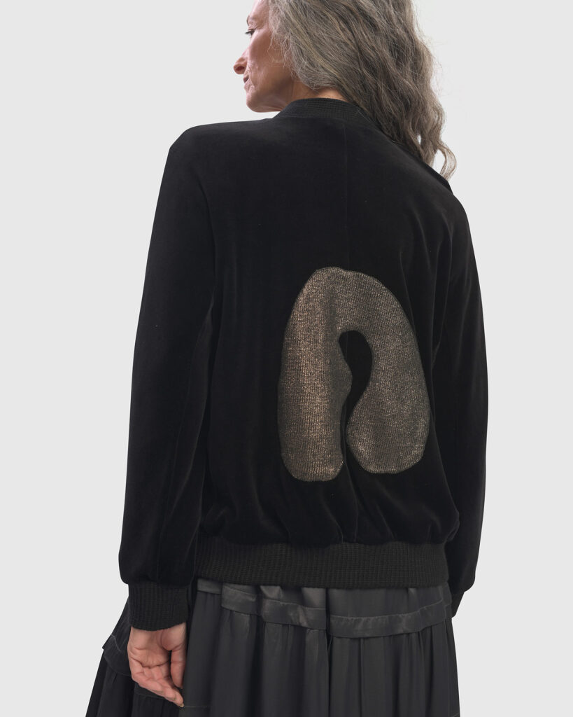 A showroom favorite, our sumptuous velvet jacket with a flattering, relaxed fit features the same shimmery goldtone graphic as the dress, appliquéd on the back. Mock flaps finish the cozy patch pockets, which have hidden side entry. And rib knit trim completes the look. In this photo, Rachel is also wearing our URBAN SATIN BABYDOLL DRESS, a sleek and swingy number in a stunning steel grey hue, which also comes in black.