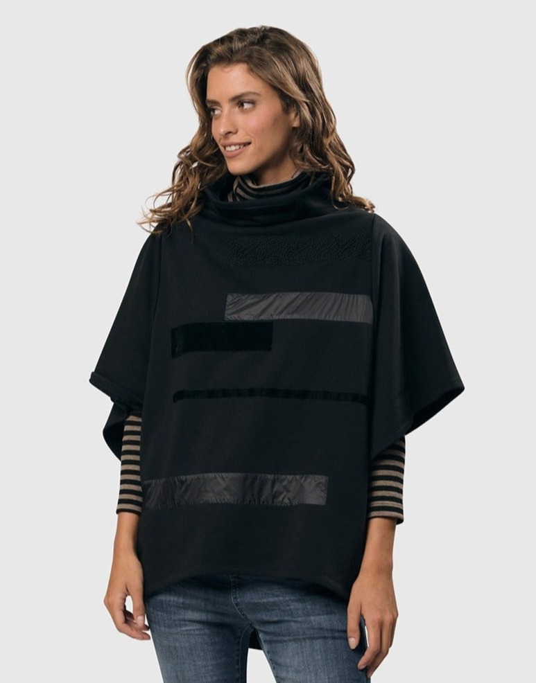 Our luxe French terry knit is equally as chic over jeans as it is layered over a satin dress. Velvet, ribbon and Venetian lace appliqués adorn the front of this relaxed, oversized silhouette in an effortless pullover style. The draped funnelneck is relaxed enough to layer a turtleneck beneath it, and the full-cut kimono sleeves let you show off your whatever you wear underneath. Maya is wearing our URBAN GATEAU TURTLENECK TOP and DENIM ICONIC STRETCH JEANS. And if you like this top, you’ll love the URBAN APPLIQUED TRAPEZE DRESS with asymmetrical hem. It has the same front adornment—modern accents of velvet and Venetian lace. Just perfect!