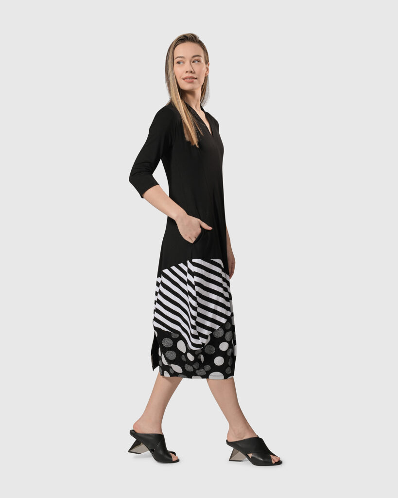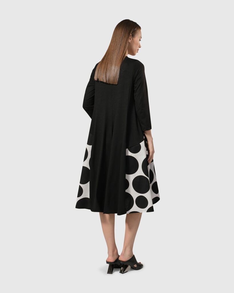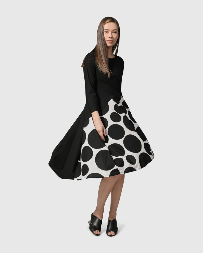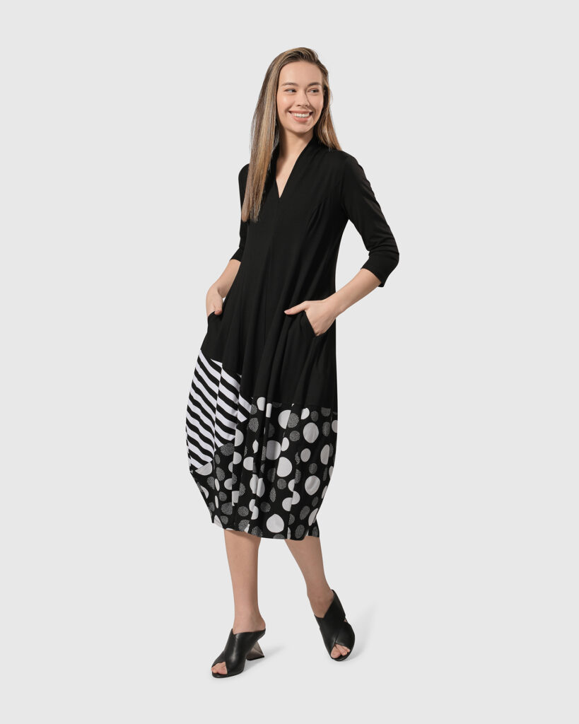Twirl up to the bar and celebrate your amazing self in our Cantina Wonderful Dress. Made with a classic black woven panel on top, oversized pockets, a loose flowing waist and a flowy bold dot skirt that falls just below the knee. This easy style is perfect for a quick getaway.