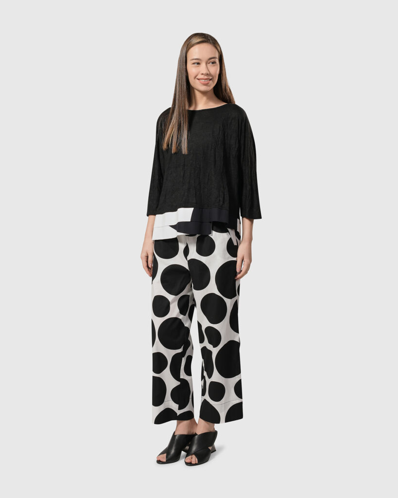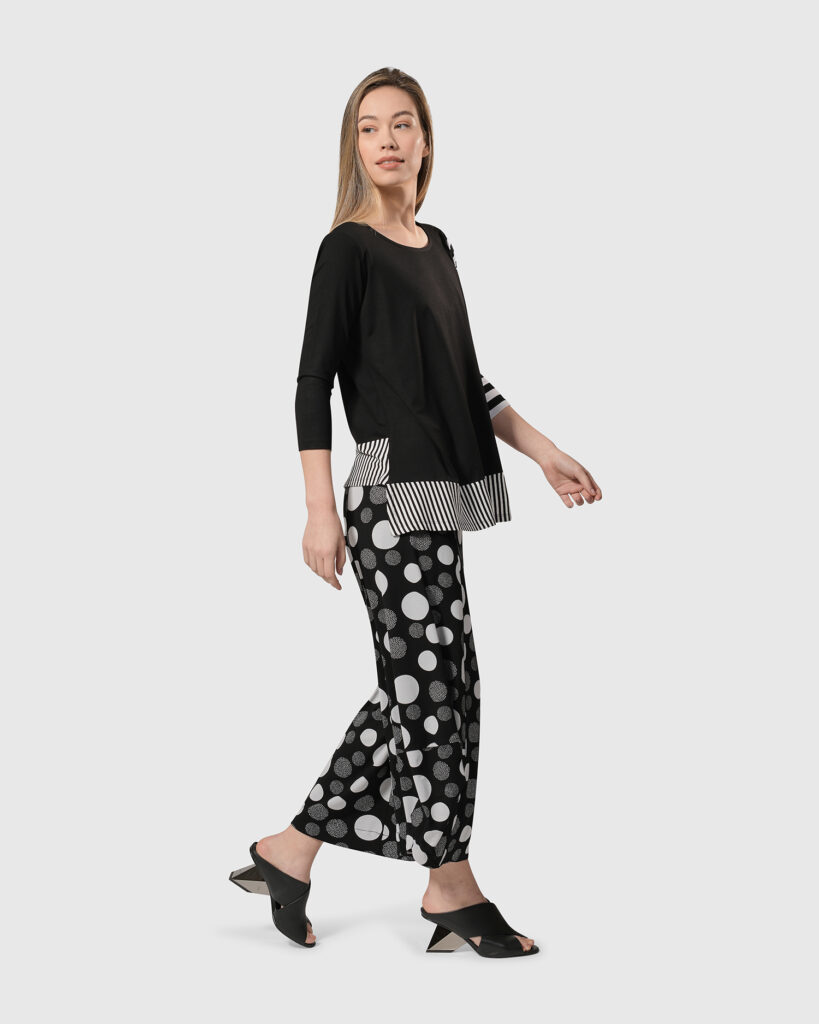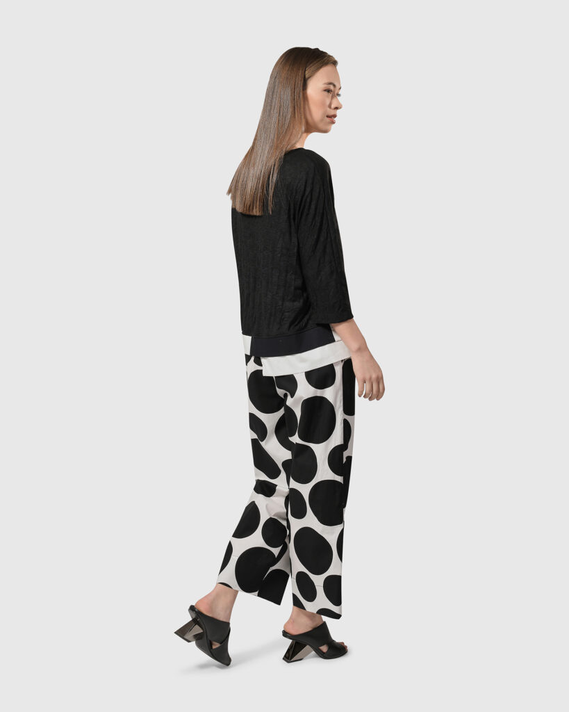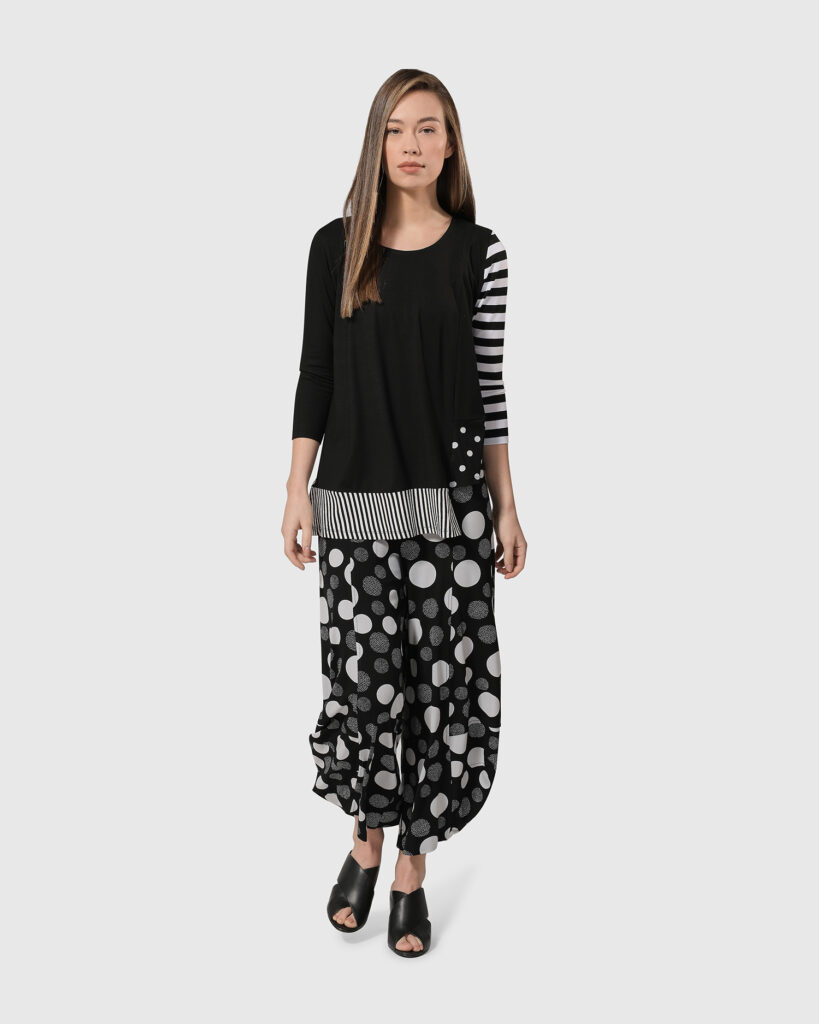 Stake your claim and take one small step as a fashiony femme with the Mod Flag Top. The soft, stretch knit with an uneven bottom hem is alluring and worthy of saluting. Classic dots and stripes in black and white are neutral and will have you over the moon with delight. Pairs well with our Galaxy Punto Pants. The relaxed-fit knit design with an easy stretch waist feels like you’re floating in space. The mock fly and gorgeous hem with tapered detail make these pants the star of any wardrobe.