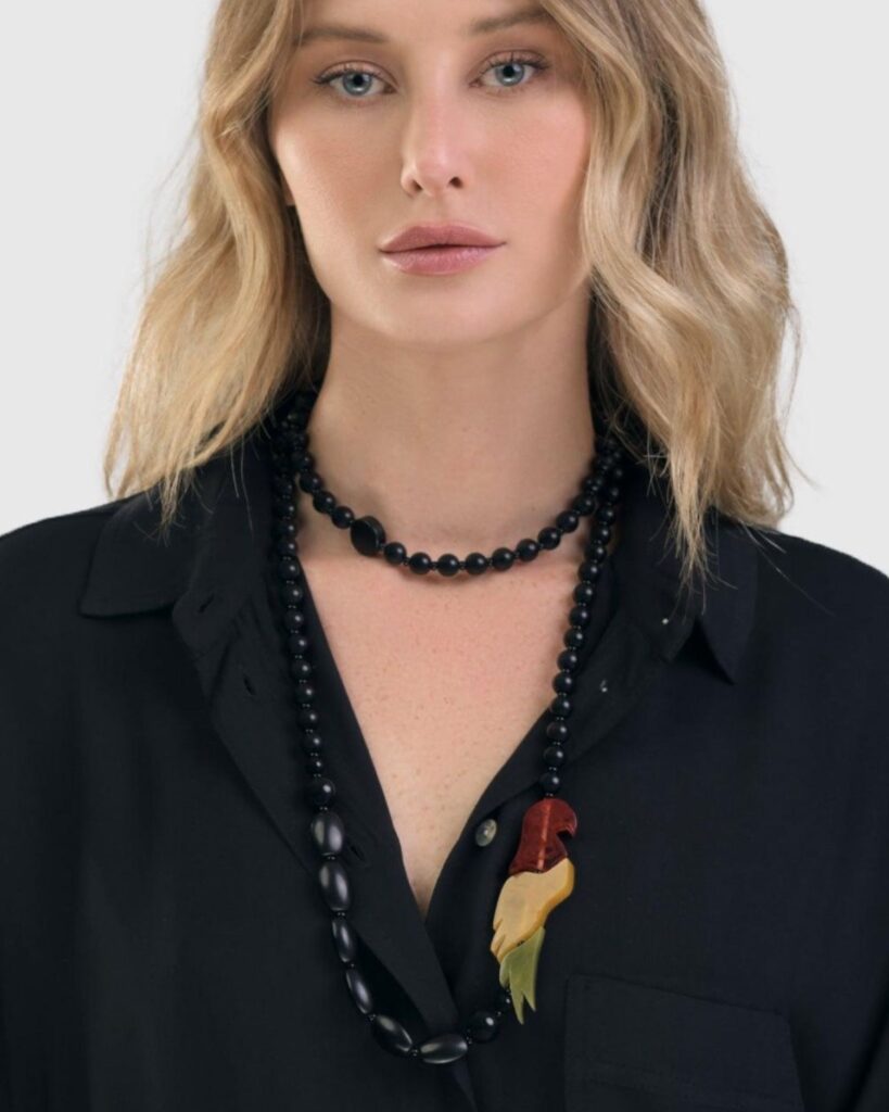 Here, Katya is wearing the TAHITI BIRD BEAD NECKLACE, which is strung with black oval beads that are inspired by smooth river rocks. The bird flaunts beautiful colors and is created by three separate beads that fit together like puzzle pieces and have an intriguing, subtle translucence to the colors.