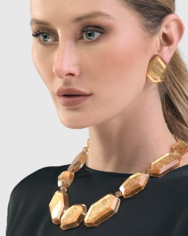 Another lovely quality of resin is that it can be combined with other materials such as the application of slivers of gold leaf, as you see in the GLORY FACETED BEAD NECKLACE & GLORY FACETED CLIP EARRINGS. Each piece is handmade in a meticulous and multi-phased process rendering it slightly different from all of the others. The made-to-match Glory duo shown on Katya has a reflective surface that looks different from all angles as it catches the light of your environment.