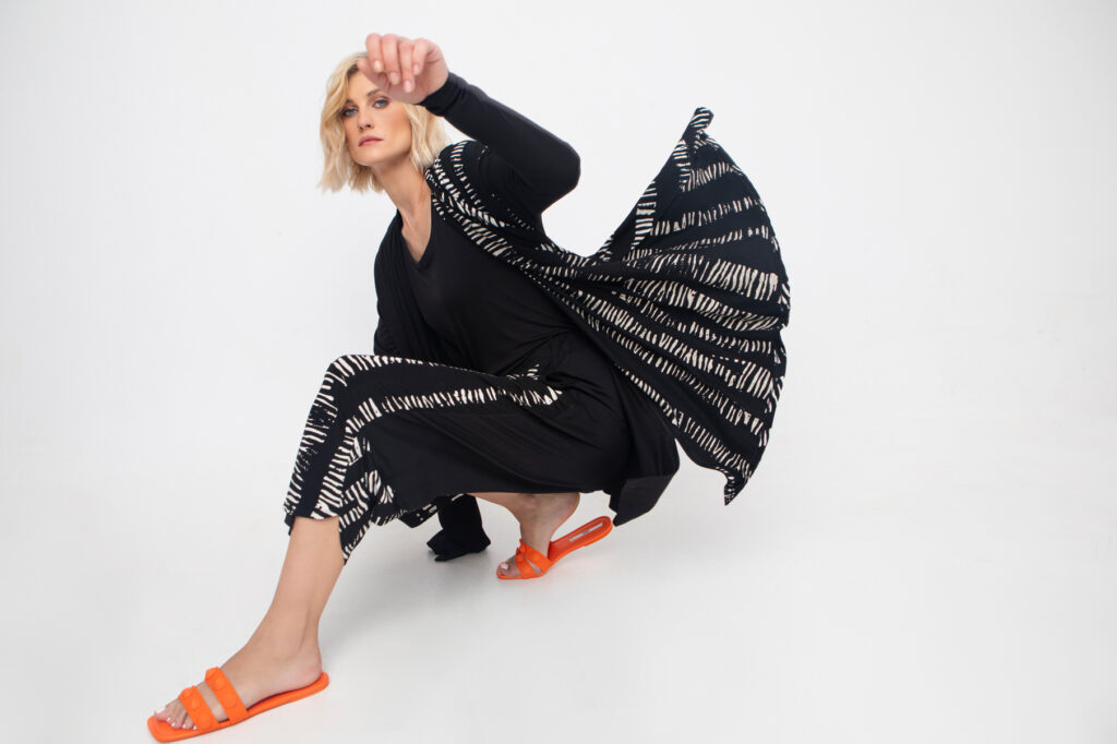 We know how much you love ultra-soft jersey knits for their beautiful drape and outstanding comfort… And Ozai N Ku has brought you separates that are so irresistible, we named them “Bliss.” Above, the super-swingy BLISS OPEN-FRONT CARDIGAN layers over so many looks (every black and white piece in your closet), adding edge with a cool matchstick print on one side. But if you can’t get enough, like me, the matching BLISS TULIP PANTS will never, ever let you down. They are not only impeccably tailored with details galore, like slimming inverted side pleats and a chic tulip hem, but so dang comfy you won’t want to take them off.