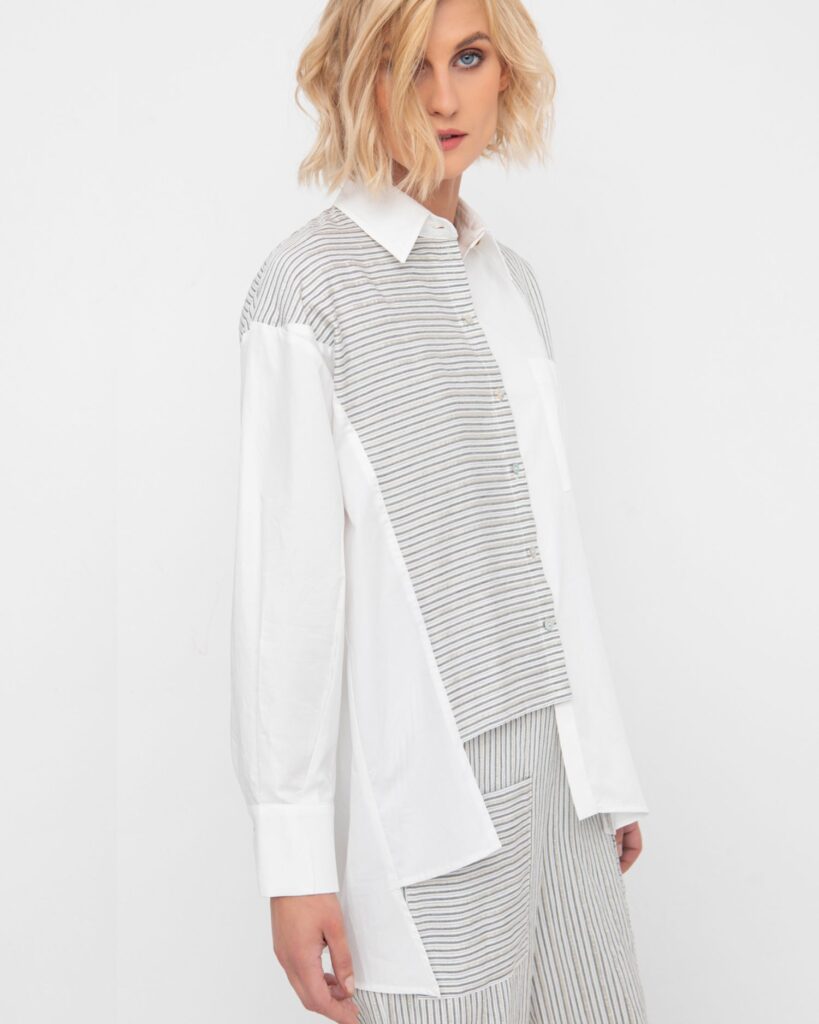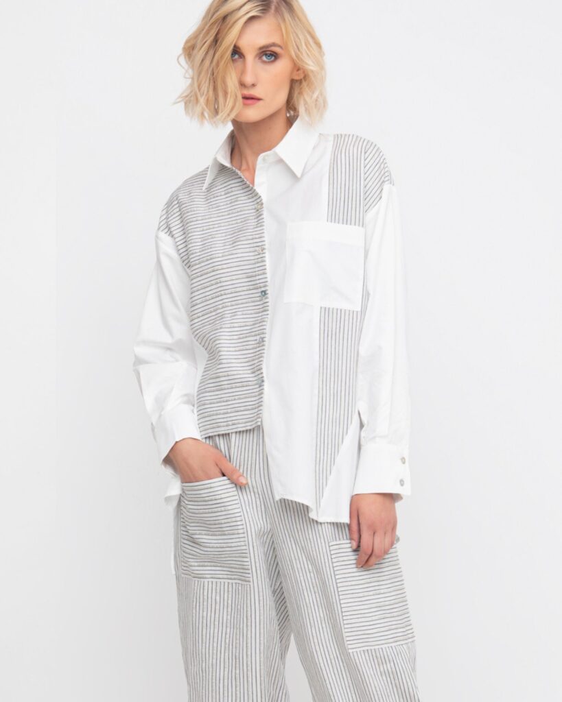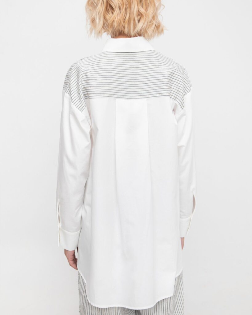 THE JANE SHIRT is definitely not your basic button-down! It is pure cotton for cool comfort and breathability, but it’s so much more… A beautiful variegated stripe in cream and silvery grey mixes with white in a meticulously pieced design, destined for compliments. One of the many touches I love are the natural shell buttons in front and on the cuffs, which have that subtle iridescent glow. The stepped cutaway hem on one side is another gorgeous detail and a box-pleat back with shirttail hem completes this must-have shirt.