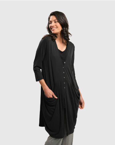 This no-fuss Essential Draped Cocoon Jacket adds an extra layer of warmth, has pockets to carry things and can be left open for convenience.