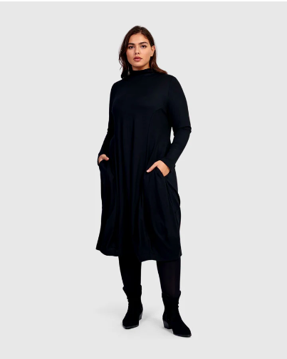 A-Line Dresses and Skirts: This style balances the pear shape by accentuating the waist and providing a more proportionate silhouette. An example is our Essential A Line Dress, Black.