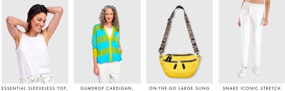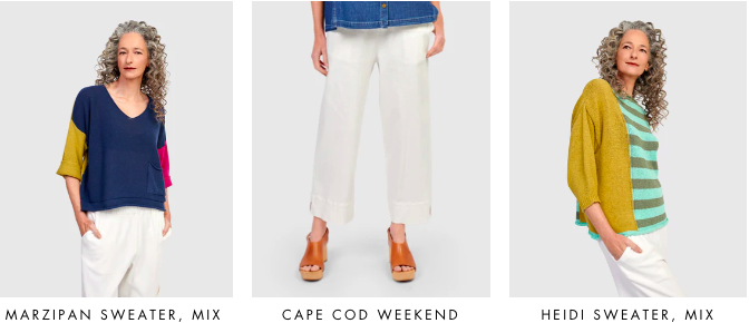 Coco Cardigan (left), Palma Capri Pants (center) Jolly Sweater (right)