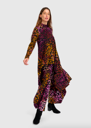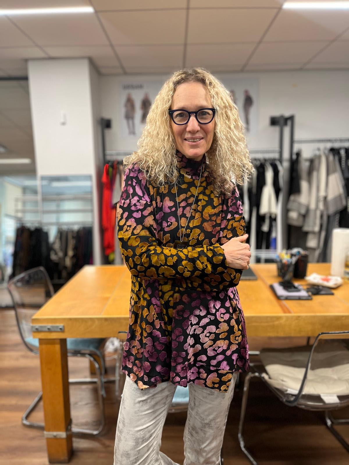 Yael in Alembika’s Pallas Trapeze Top (left). Tempest Hi-Lo Tunic Top shown center on Phyllis with black leggings and paired with Cheshire Punto Pants (right). There are many more styles with this pattern in The Shades of Brown Collection.