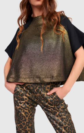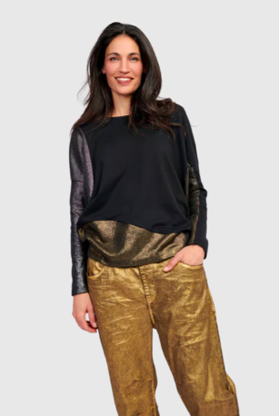 Horizon Metallic Top, Lola Heart Tee, Silver (also in Gold), Velma Raglan Top, Gold (also in Silver). Tops are paired with styles from Alembika’s Iconic Stretch Jeans.