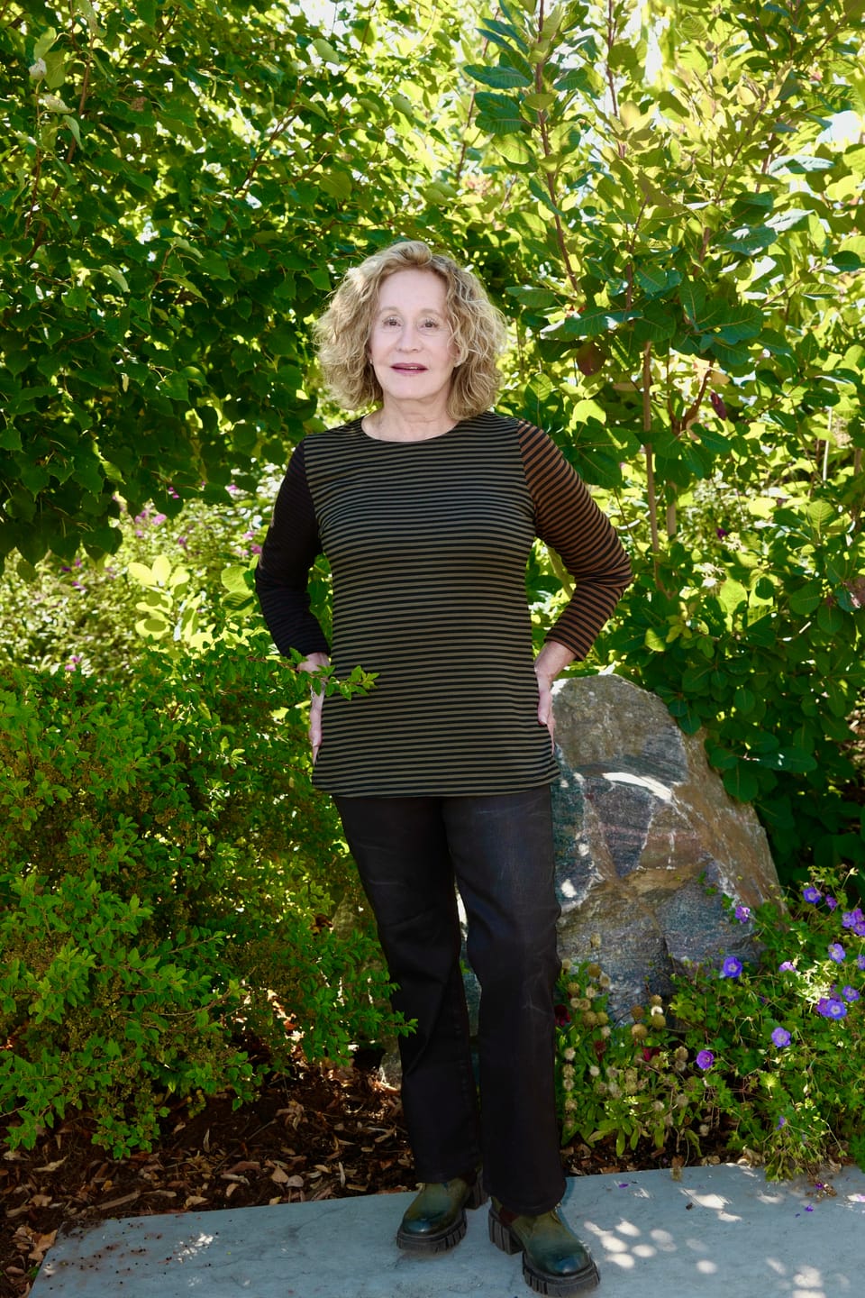 Judy in Urban Layering Hip Tee in Stripes (left), “Beautiful shirt — so soft and versatile. Can be paired with jeans or leggings.”