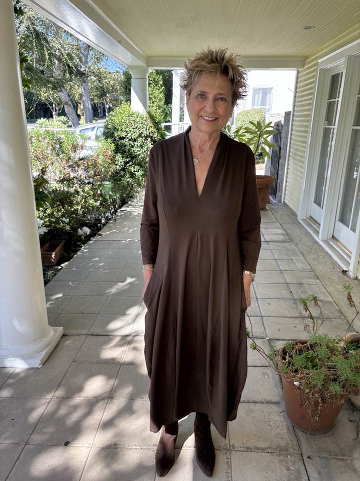 Lizzie in Essential Slinky Cocoon Dress, Sepia (center), “Loving my new purchases. You guys are my new favorite store!”
