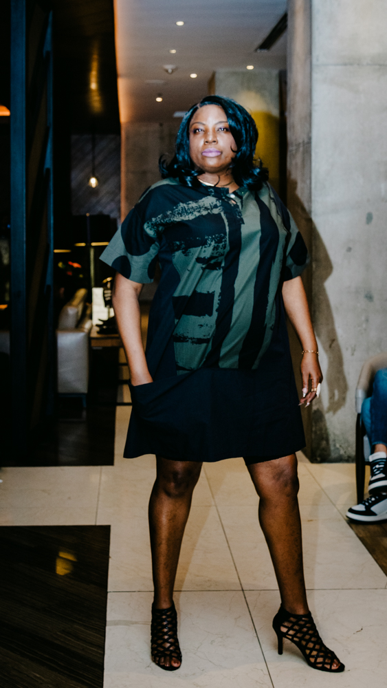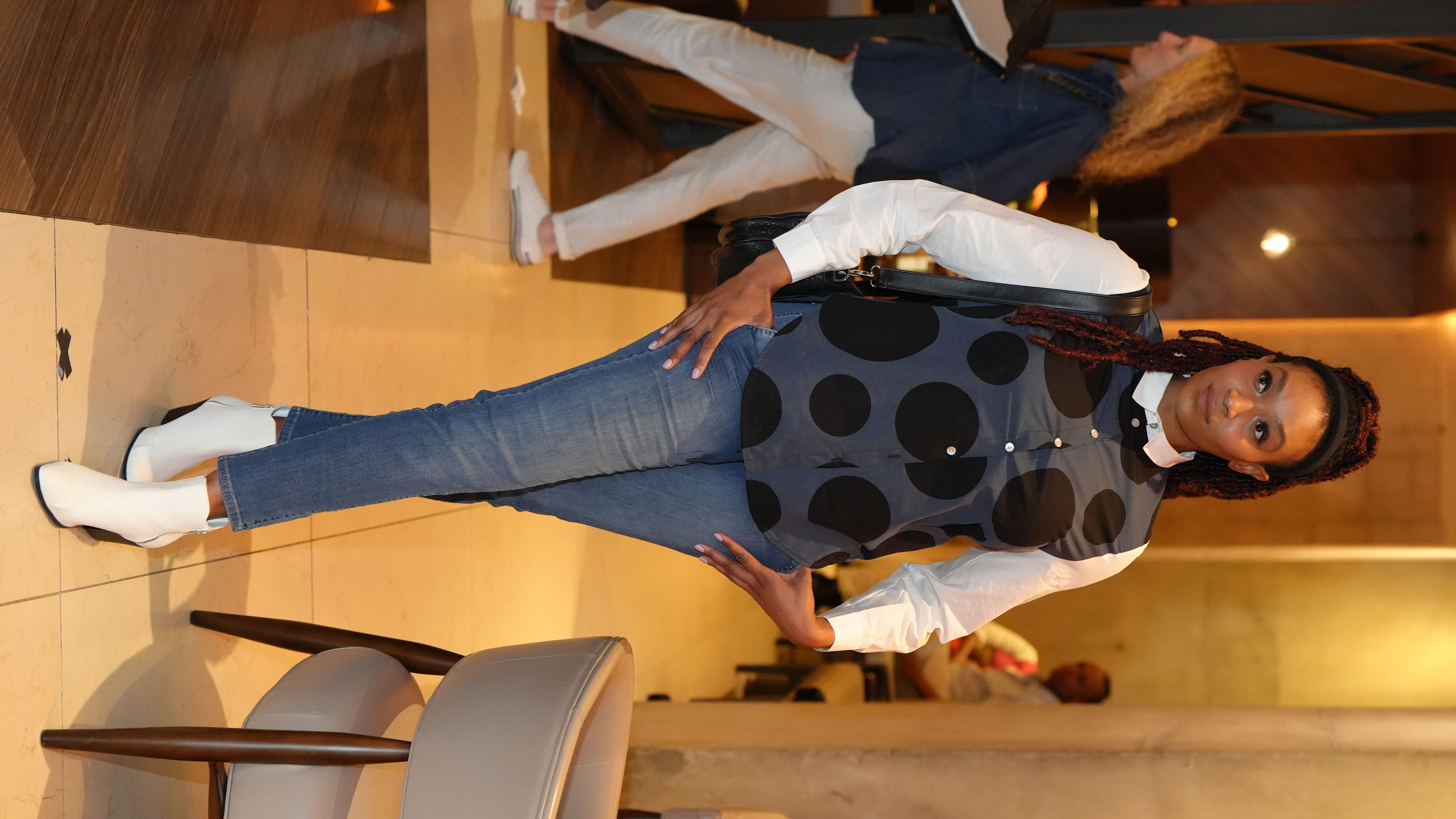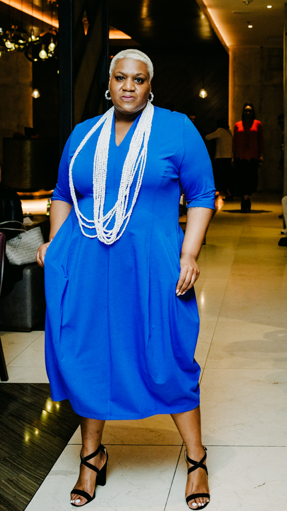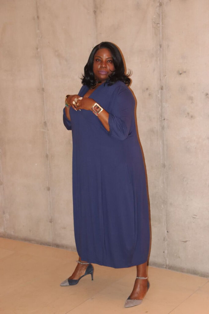 Rasheema (@rahtheblessed1) wears Alembika size 3x in the CARLA COCOON MIDI DRESS, COBALT (left), size 6 in the SNAKE ICONIC STRETCH JEANS, ECRU and a size 8 in the URBAN CINCH TUNIC TOP, WHITE/BLACK with the CIRCLE CANTEEN BAG, IVORY (center) and the NEXT PASHMINA NECKLACE, RED (right).