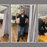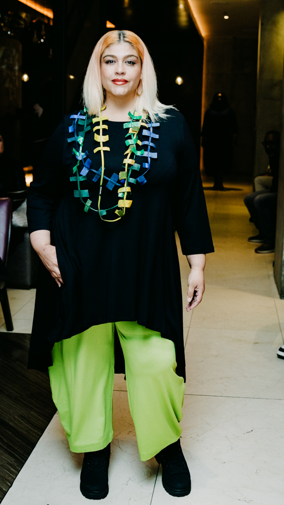 Nicole (@xponentialcurve) wears Alembika size 7 in the ESSENTIAL SWING TUNIC TOP, BLACK with ESSENTIAL FLOW PANTS, LIME and is wearing the 3-STRAND RECYCLED LEATHER NECKLACES, AURORA BOREALIS (left). Pam (@pmcca36781) wears Alembika size 2x in the AYLA TRAPEZE MIDI DRESS, COBALT (center) and an XL in the SAFFRON SHIRT DRESS, BOUQUET (right).